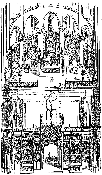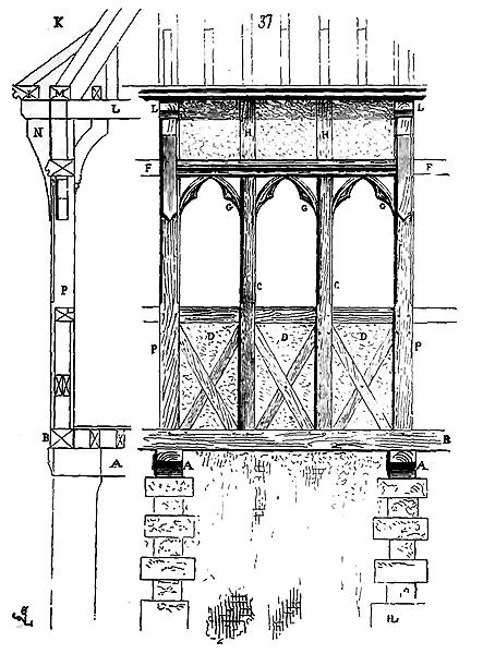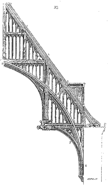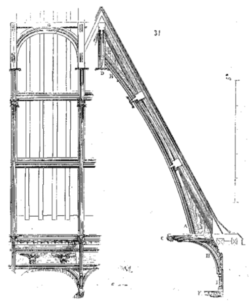 La nef et les transsepts de la cathédrale d'Ély sont encore couverts par une belle charpente qui date de la fin du XIVe siècle. Nous donnons (31) une ferme de cette charpente ainsi que l'entre-deux des fermes. La grande courbe A B est d'un seul morceau; elle s'assemble à sa base dans le grand blochet C, à son sommet, dans le faux poinçon D. Les vides triangulaires E F sont remplis par des madriers, assemblés en feuillure sous l'arbalétrier et dans l'extrados de la courbe, afin de rendre les courbes et arbalétriers solidaires. Les pannes sont prises entre l'arbalétrier et sa courbe. Le sous-faîte G est soulagé par des liens courbes. Quant au blochet, il est maintenu horizontal par le lien courbe H, et le vide laissé derrière ce lien est rempli par des madriers; ces liens portent sur un potelet I taillé en forme de colonnette et sur un corbelet K engagé dans le mur. Une corniche avec frise en bois, ornée de demi-figures d'anges tenant des écussons, masque les sablières et la tête du mur. Il n'est pas besoin de dire que cette charpente était décorée de peintures. La solidité de cette charpente réside principalement dans la grosseur des bois employés et dans l'extrême aiguité des deux courbes reportant une grande partie de la poussée sur le potelet I, c'est-à-dire en contrebas de la tête du mur. Ce système étant adopté conduisit les charpentiers anglo-normands à des combinaisons fort savantes et d'une grande hardiesse d'exécution.