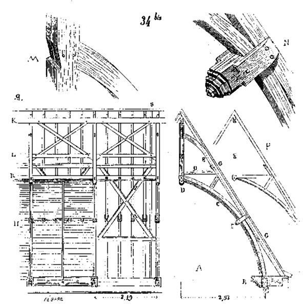 Voici (fig. 33) une vue perspective d'une travée qui nous évitera de longues explications. C'est sur la tête des poteaux D qu'est placé le cours principal de pannes O, soulagé par des liens L et des remplissages à claire-voie. Des goussets M réunissent l'entrait retroussé A à la panne; ils contribuent anssi à empêcher le hiement 13 des fermes et des chevrons. Ce cours principal de pannes est doublé d'un plateau formant saillie sur lequel viennent s'assembler des jambettes destinées à arrêter le glissement des chevrons posés au-dessus des lucarnes. Les autres cours de pannes I sont soulagés par des liens courbes N suivant le plan du chevronnage et assemblés dans les arbalétriers. On remarquera que le cours de pannes inférieur I' est en outre maintenu par des contre-fiches P venant reposer sur l'extrados de la grande courbe moise; c'est qu'en effet ce cours inférieur de pannes doit porter, non-seulement le chevronnage, mais aussi les combles des lucarnes R; il eût certainement fléchi à l'intérieur s'il n'eût été contrebutté par ces contre-fiches. Il y a, entre fermes, onze chevrons.