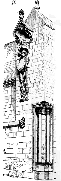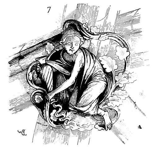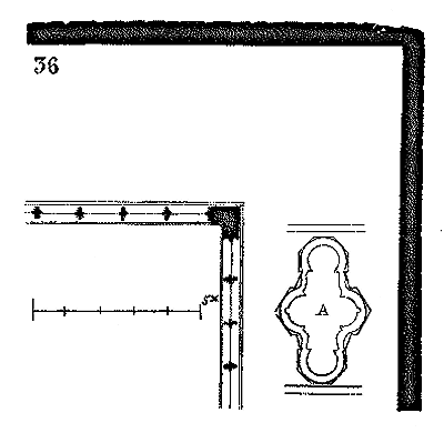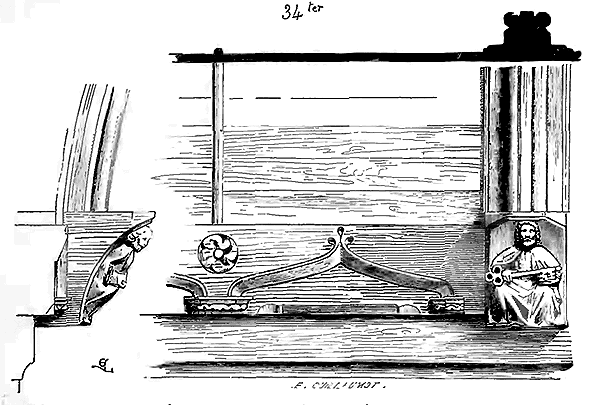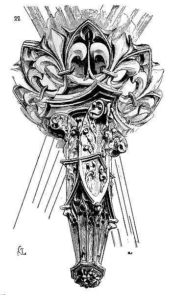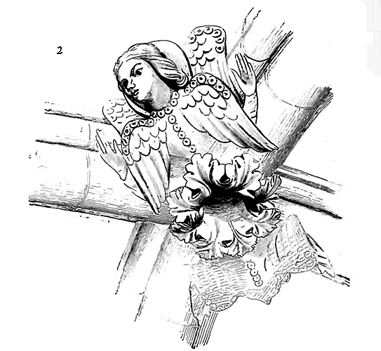 Afin de donner une idée de la beauté d'exécution de cette oeuvre unique de charpenterie, nous dessinons (fig. 34) un détail de sa partie inférieure. Les extrémités des grands blochets qui reçoivent les pieds des poteaux D sont décorées de figures d'anges tenant des écussons aux armes écartelées de France et d'Angleterre, le tout pris dans la masse du bois. Seules, les ailes des anges sont rapportées. En S, nous donnons la coupe des deux courbes faite sur J T; en V la coupe sur l'un des montants de la claire-voie de remplissage, et en X la coupe sur Y Z du blochet. Autant qu'on peut en juger sans démonter une charpente, les assemblages, les tenons sont coupés avec une rare précision; c'est grâce à cette pureté d'exécution, et plus encore à la qualité des bois employés ainsi qu'à la bonté du système, qne la charpente de la grand'salle de Westminster s'est conservée intacte jusqu'à nos jours.