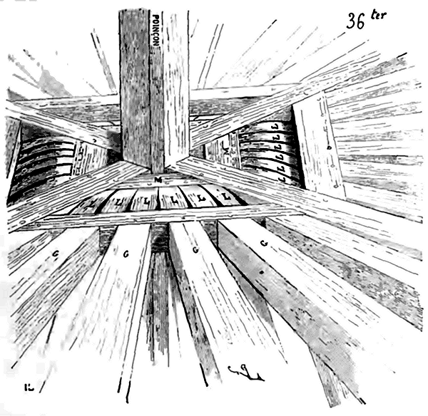 Cette salle était éclairée par des lucarnes, comprenant deux entre-chevrons, figurées dans la coupe longitudinale (27) en N, et par des jours pris dans l'un des deux pignons en maçonnerie. Les chevrons, jambettes et esseliers courbes n'ont que 0,20c. sur 0,16c. d'équarrissage posés sur champ, et ainsi des autres bois en proportion; il semblait qu'alors les charpentiers cherchaient à répartir également le poids des charpentes de combles sur la tête des murs et à le réduire autant que possible. Du reste, tous ces bois sont des bois de brin et non de sciage, équarris à la hache avec grand soin, et bien purgés de leur aubier (voy. BOIS). C'est ce qui explique leur parfaite conservation depuis près de cinq siècles. Il n'est pas besoin de dire que cette charpente, à l'intérieur, est lambrissée au moyen de bardeaux cloués sur les courbes avec couvre-joints. Ces bardeaux sont généralement décorés de peintures, ainsi qu'on peut le voir encore dans la grand'salle du palais ducal de Dijon, dans l'église de Sainte-Madeleine de Châteaudun, etc. (voy. PEINTURE).