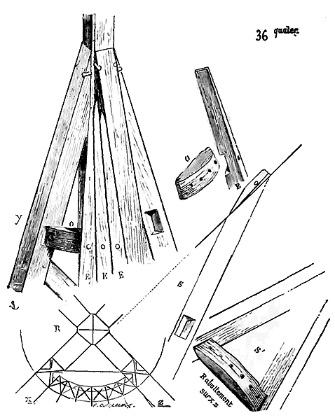 Nous donnons (34 ter) le détail des sablières, des blochets, des gros et petits couvre-joints rapportés sur les bardeaux, à l'échelle de 0,05 c. pour mètre. On remarquera (fig. 34 bis) que les courbes du chevronnage viennent s'assembler dans des entraits retroussés, qui eux-mêmes s'assemblent dans les entre-toises R posées d'un poinçon à l'autre. Cela n'est guère bon; mais on se fiait, avec assez de raison, aux bardeaux pour maintenir les courbes légères du chevronnage, ces bardeaux formant comme une voûte qui offrait elle-même une assez forte résistance. Entre les chevrons, espacés de 0,45 c. environ d'axe en axe, sont posées, sous la volige, des chanlattes destinées à lui donner une plus grande solidité 14.