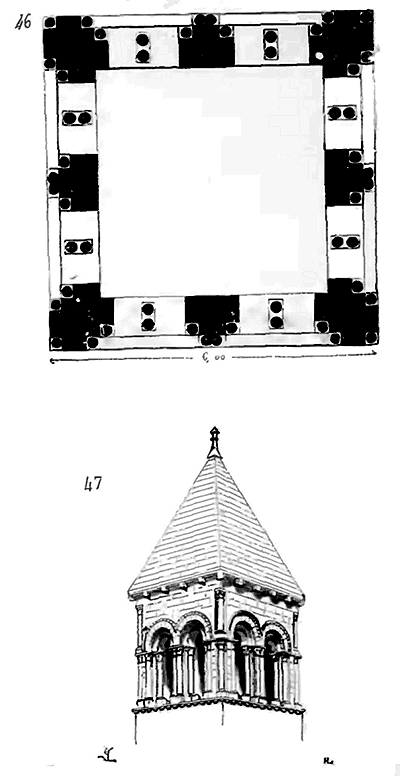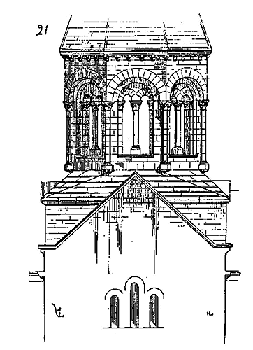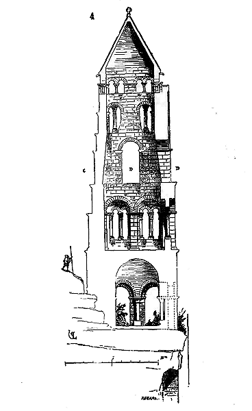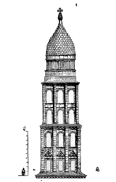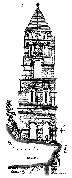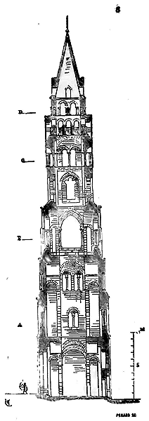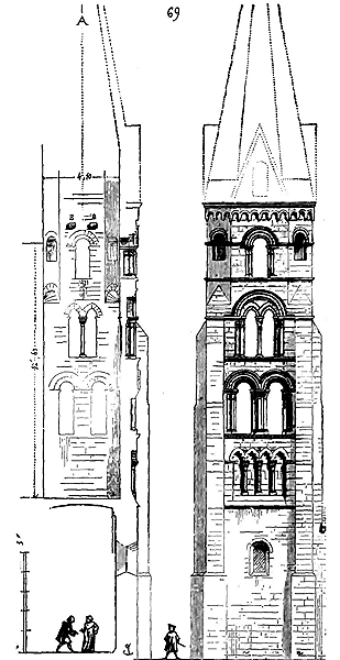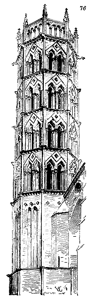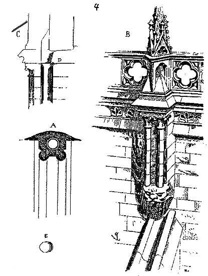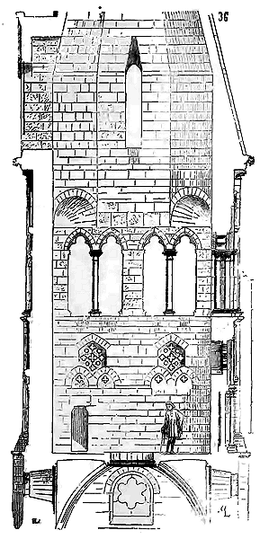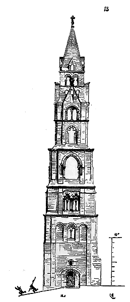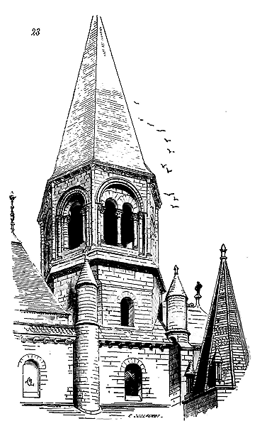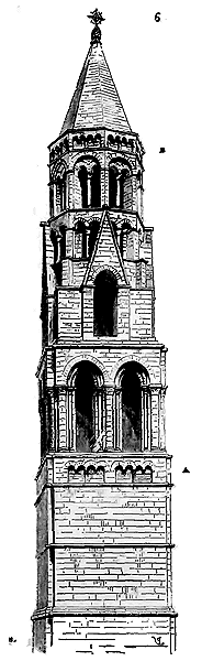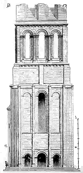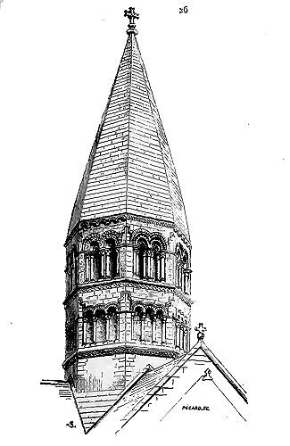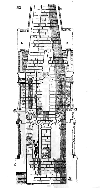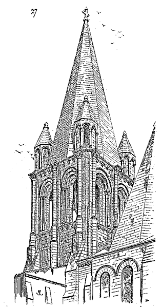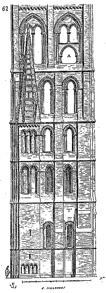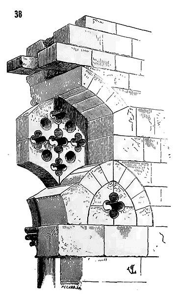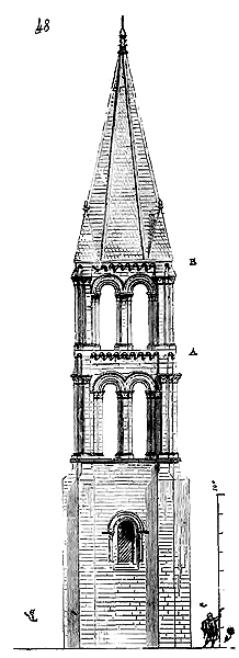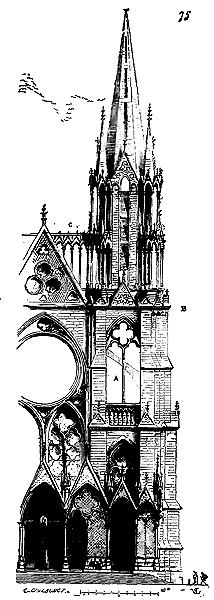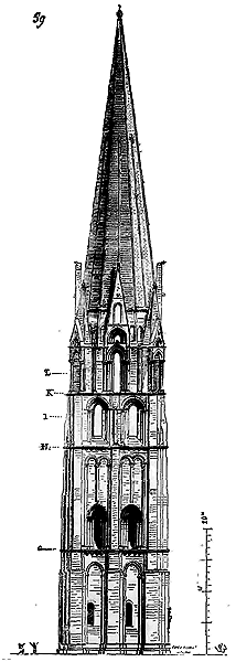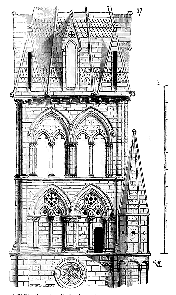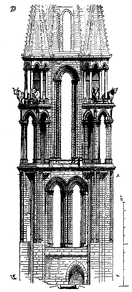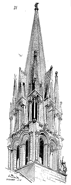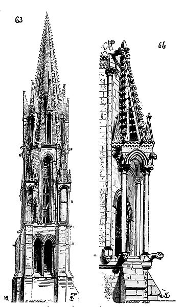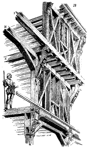 Depuis le XIIe siècle, on avait pris le parti d'élever, soit sur les tours, soit au centre de la croisée des églises, de hautes flèches de bois recouvertes d'ardoise ou de plomb. Ces flèches exigeaient, les dernières surtout, des combinaisons fort savantes afin de reporter le poids de tout le système sur les quatre piles des transsepts. Dès le commencement du XIIIe siècle, les charpentiers avaient su élever d'une façon ingénieuse ces masses énormes de bois et les suspendre au-dessus des fermes des noues, sans charger les arcs doubleaux bandés d'une pile à l'autre. Nous aurons l'occasion de nous occuper de ces sortes de charpentes au mot FLÈCHE, auquel nous renvoyons nos lecteurs.