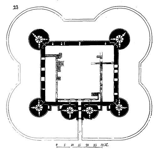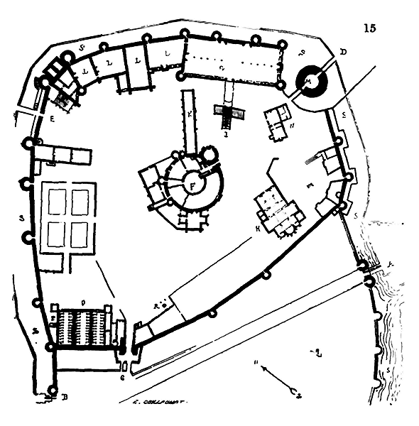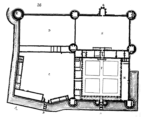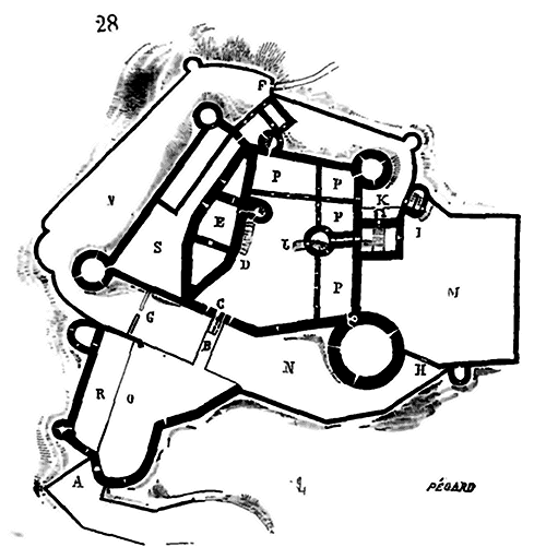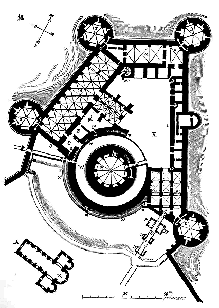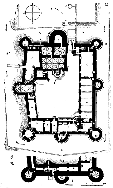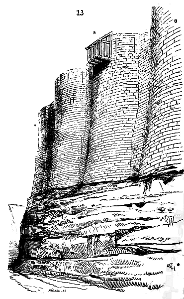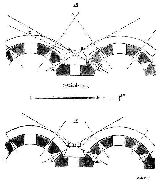 Nous donnons d'abord (26) la coupe transversale de cette charpente. Les poutres qui portent les solives du plancher de la salle ont 0,63 c. d'épaisseur sur 0,50 c. de largeur et 11m,90 c. de portée. Ces poutres A sont soulagées par des corbeaux de pierre B. Du côté de la cour, d'autres corbeaux reçoivent la première sablière C qui pose du côté extérieur sur la tête du mur; cette sablière a 0,30 cm d'épaisseur sur 0,24 de largeur. Un second rang de sablières D de même équarrissage reçoit les jambettes E qui se courbent à leur extrémité pour s'assembler dans les chevrons. Du niveau du plancher au sommet de l'ogive formée par le lambris intérieur on compte 10m,20 c. Au-dessus du dernier plancher, le mur, réduit à une épaisseur de 0,95 c., s'élève jusqu'à une hauteur de 2m,00, reçoit deux sablières et sert de séparation entre la grand'salle et les chemins de ronde munis de machicoulis et de meurtrières. Les chemins de ronde, clos à l'extérieur par un parapet de 0,26 c. d'épaisseur, en pierre, sont couverts par de grands coyaux G raidis par de petites contre-fiches H taillées en courbe à l'intérieur, ainsi que le pied des coyaux, de manière à former un petit berceau en tiers-point sur ce chemin de ronde (voy. le détail X). On remarquera que les blochets P sont composés de deux moises venant saisir les jambettes et le pied des chevrons assemblés dans la sablière extérieure R.