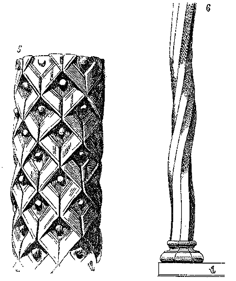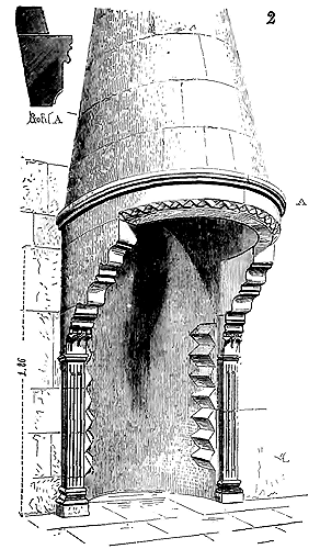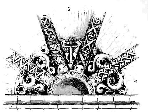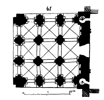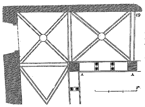 Le voligeage extérieur posé en travers reçoit la tuile, creuse aujourd'hui, autrefois très-probablement romaine 6. La volige en travers est nécessaire pour retenir le glissement de la tuile, que le fil du bois posé suivant la pente eût occasionné facilement. Cette charpente, si simple dans ses combinaisons, est décorée de la façon la plus splendide par des peintures et des dorures. Le petit plafond sous-faîte se compose de deux rangs de caissons étoilés et creusés en forme de petites coupoles, pénétrant dans les entre-deux des châssis C, fig. 17. Une sorte de pâte ou de mastic revêt ce plafond et se détache sur les fonds, en fleurons et tigettes peu saillants. Cette partie de la charpente est particulièrement riche en dorure et en magnifiques ornements peints, de sorte qu'en entrant dans la cathédrale de Messine on est tout d'abord frappé par cette ligne de caissons disposés suivant l'axe de l'édifice et qui conduisait l'oeil à la riche mosaïque absidale qui existait autrefois au-dessus du sanctuaire. Les arbalétriers et les chevronnages ont admis des tons plus sombres, comme pour faire ressortir davantage l'éclat de cette épine toute semée d'azur clair et de tons blancs et roses sur des fonds d'or (voy. PEINTURE).