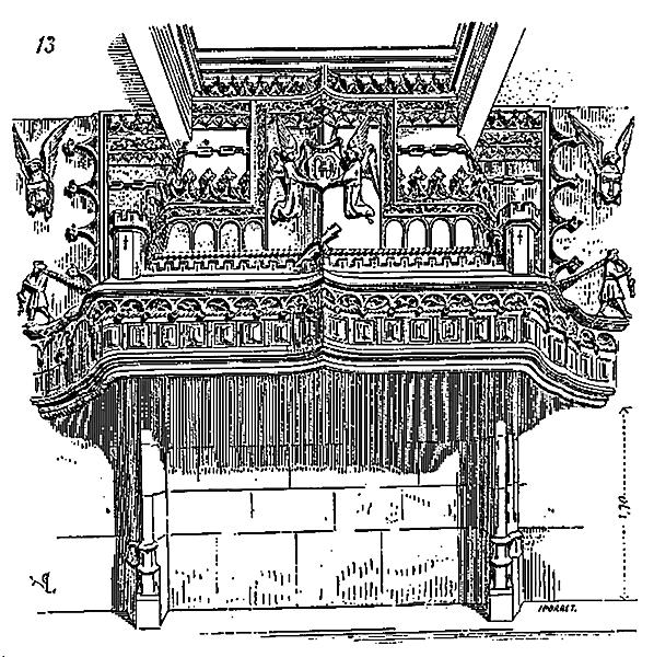 Cette charpente, malgré le soin apporté dans les assemblages, a poussé au vide, et, comme nous l'avons dit plus haut, on a dû, quelques années après sa construction, maintenir son écartement par des entraits posés de deux en deux fermes; elle paraît dater des dernières années du XVe siècle.