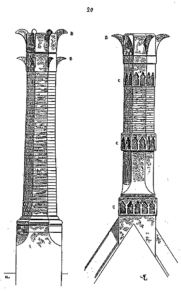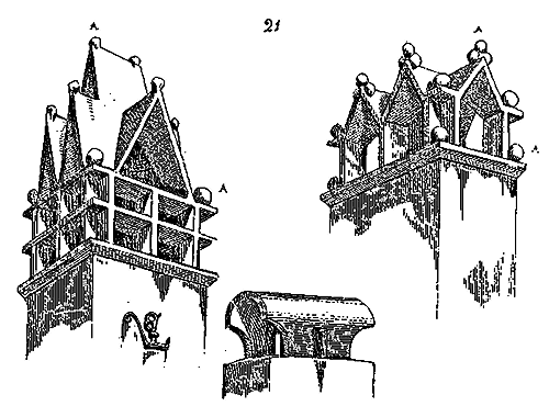 La fig. 20 représente l'un d'eux. Posés sur des blochets, les pieds des chevrons sont raffermis par des jambettes courbes N; un entrait retroussé O les réunit, et deux contre-fiches PP, assemblées à mi-bois avec l'entrait retroussé, viennent étayer les chevrons au-dessus du berceau en RR, en même temps qu'elles empêchent le triangle de se déformer par l'action du vent ou d'une charge plus forte d'un côté que de l'autre. Dans la coupe longitudinale E, on voit en S la rencontre des contre-fiches assemblées tenant aux chevrons, et comment cette rencontre ne gêne en rien le passage des grandes croix de Saint-André longitudinales. Cette charpente porte de la latte et de la tuile depuis six siècles, sans avoir subi aucune altération grave, et malgré qu'on ait coupé plusieurs pièces pour passer des tuyaux de cheminée.
