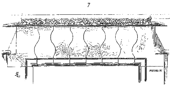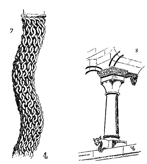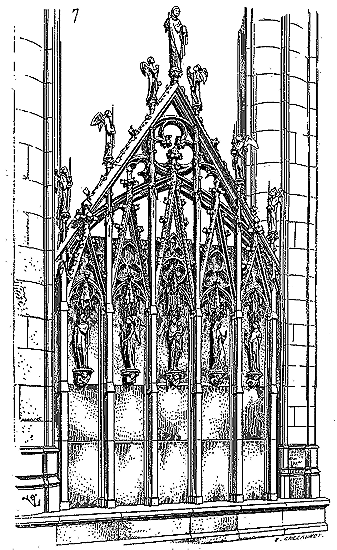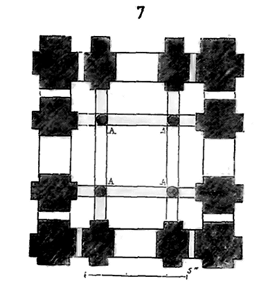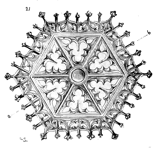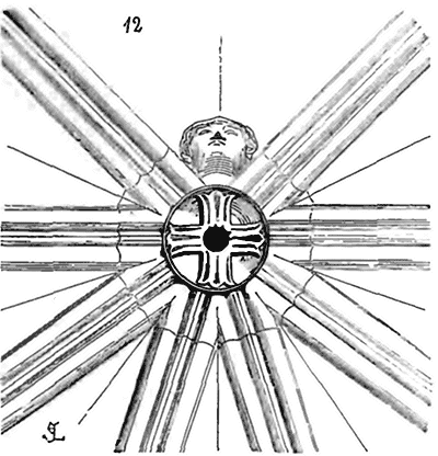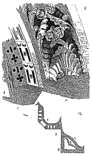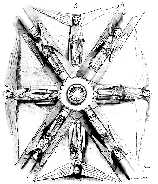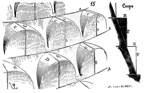 Pendant ces essais, la voûte en arcs d'ogives prit naissance. Dans les premiers moments, cependant, les clefs des arcs doubleaux et des arcs ogives des voûtes nouvelles atteignaient un niveau supérieur à celui des clefs des formerets, comme à la cathédrale de Langres, comme encore dans le choeur de la cathédrale de Paris, et il fallut avoir recours au système de charpente représenté dans la fig. 6. Ce ne fut guère qu'au commencement du XIIIe siècle que, la voûte en arcs d'ogives ayant atteint sa perfection (voy. VOÛTE), les charpentes de combles purent se développer librement, et qu'elles adoptèrent promptement des combinaisons à la fois stables, solides et légères.