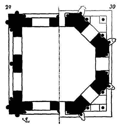 Un exemple fort simple fera comprendre ce système (28) 11. Cette ferme, sans entrait à sa base, se trouve, il est vrai, intercalée entre d'autres fermes qui en sont pourvues; elle n'est pas le résultat du hasard, mais d'un système souvent employé pendant les XIIIe et XIVe siècles. Le blochet A, sculpté à son extrémité vue, est pincé entre deux sablières B assemblées avec lui à mi-bois; une forte courbe D, d'un seul morceau, s'assemble dans l'arbalétrier C au moyen d'un long tenon doublement chevillé. La panne E inférieure est prise entre la courbe et l'arbalétrier; elle est franche, la courbe et l'arbalétrier étant entaillés pour la laisser passer. La panne E' supérieure repose dans une entaille pratiquée à l'extrémité de l'entrait retroussé F et dans l'arbalétrier. Ainsi les chevrons dont l'épaisseur est indiquée par la ligne ponctuée viennent araser la face extérieure de l'arbalétrier. Cette ferme n'a que 5m,40 de portée, et ses arbalétriers ne pourraient s'écarter sans déformer les courbes, ce qui n'est guère possible, ou sans briser les tenons dans l'entrait retroussé, lesquels ont une grande force et sont bien chevillés. Mais lorsque les portées étaient plus grandes, il eût été difficile de trouver des courbes d'un seul morceau. Les charpentiers anglo-normands en assemblèrent deux l'une au-dessus de l'autre, ainsi que l'indique la fig. 29, en ayant le soin de donner à leurs bois un fort équarrissage, afin d'obtenir des tenons très-puissants. Le point faible de ces charpentes était cependant à leur sommet. Il était facile, par des combinaisons de courbes et des bois d'un fort équarrissage, de donner aux arbalétriers une parfaite rigidité; ce qu'il était difficile d'empêcher, sans le secours de l'entrait, c'était la dislocation des assemblages à la tête de la ferme, par suite de l'écartement des deux arbalétriers.
