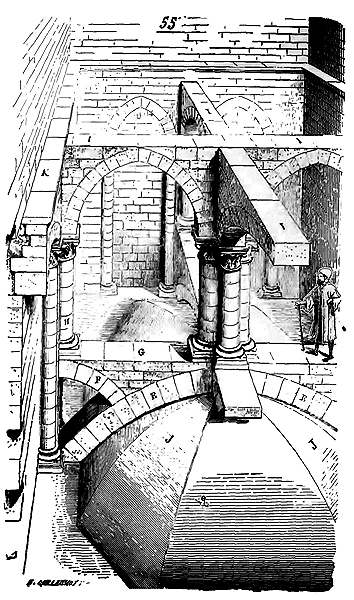 Les Romains devaient être fort habiles dans l'art de la charpenterie, car les voûtes sphériques ou d'arêtes qu'ils élevèrent en si grand nombre exigent, pour être construites, des combinaisons de charpente fort compliquées et difficiles à assembler. Dans leurs établissements militaires, ils employaient le bois à profusion; il suffit, pour s'en convaincre, de regarder les bas-reliefs de la colonne Trajane à Rome. Les contrées de l'Europe où ils portèrent la guerre étaient d'ailleurs presque entièrement couvertes de forêts, qu'ils défrichèrent en grand nombre, autant pour faire pénétrer leurs armées à travers ces pays demi-sauvages que pour leurs besoins. Déjà, sous l'empire romain, l'Italie ne pouvait plus fournir de bois en assez grande quantité pour les besoins du peuple-roi, et les forêts des Gaules, pendant plusieurs siècles, servirent d'approvisionnements à la marine et aux immenses établissements des Romains. La facilité avec laquelle on se procurait alors cette matière première explique comment on pouvait achever très-rapidement certains travaux gigantesques, tels que des ponts, des chaussées, des barrages, des digues, des campements militaires d'une grande importance, des enceintes de circonvallation et de contrevallation, des édifices publics et des villes tout entières.