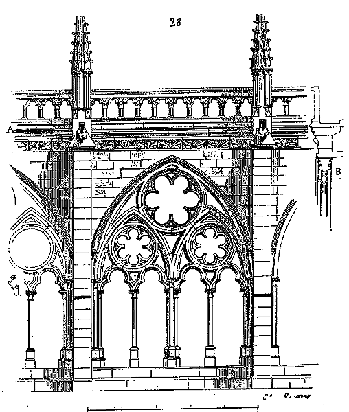 La plus ancienne charpente élevée au-dessus d'une voûte en arcs d'ogives que nous connaissions, est celle de la cathédrale de Paris; elle ne peut être postérieure à 1220, si l'on s'en rapporte à quelques détails de sculpture et quelques profils qui la décorent. Mais avant de décrire cette charpente, nous devons indiquer les modifications profondes qui s'étaient introduites dans l'art de la charpenterie, vers la fin du XIIe siècle, par suite de l'adoption d'un nouveau système général de construction. Ce n'était plus par l'épaisseur des murs ou par des culées massives que l'on contrebutait les voûtes centrales des églises à plusieurs nefs, mais par des arcs-boutants reportant les poussées sur le périmètre extérieur des édifices, quelle que fût leur largeur. C'était le système d'équilibre qui remplaçait le système antique ou roman (voy. CONSTRUCTION); dès lors, dans les monuments composés de trois ou cinq nefs, les piles intérieures, réduites à un diamètre aussi petit que possible, n'avaient plus pour fonction que de porter des archivoltes et les naissances des voûtes, entre les formerets desquelles s'ouvraient de larges fenêtres. Ces formerets et archivoltes de fenêtres ne pouvaient recevoir sur leur extrados que des bahuts dont l'épaisseur ne devait pas dépasser le diamètre des piles inférieures; il résultait de cette innovation que ces bahuts présentaient une section assez faible, surtout si, comme cela avait lieu souvent au commencement du XIIIe siècle, il fallait encore, outre la bahut, trouver, à la partie supérieure de l'édifice, un chéneau pour la distribution des eaux et un garde-corps. L'assiette sur laquelle venaient reposer les sablières des grandes charpentes de combles était donc assez étroite, et se trouvait réduite à un mètre environ; quelquefois, mais plus rarement, dans les monuments d'une grande étendue, et beaucoup moins dans les nefs d'une largeur médiocre. Il devenait impossible, sur des bahuts aussi peu épais, de trouver la place nécessaire pour appuyer le pied des arbalétriers, des chevrons, et pour projeter l'épaisseur des pannes. Afin de poser en plein les charpentes sur ces bahuts étroits, on changea d'abord la pente des combles; on la porta de 40 ou 50 degrés à 60 et même 65 degrés, puis on supprima les pannes posées sur les arbalétriers, et on composa les combles de fermes entre lesquelles vinrent se ranger des chevrons à peu près armés comme elles, affleurant le plan passant par la face externe des arbalétriers, et ne différant guère des fermes-maîtresses que parce qu'ils n'avaient point d'entraits à leur base, mais reposaient seulement sur des patins assemblés dans les doubles sablières. On désigne ces charpentes sous la dénomination de charpentes à chevrons portant fermes. C'était, dans l'art de la charpenterie, un mode de construction neuf et qui était en harmonie parfaite avec le nouveau système adopté dans la maçonnerie. Il avait 1º l'avantage de ne demander qu'une assiette aussi peu épaisse que possible; 2º au lieu de reporter la charge de tout le comble et de sa couverture sur les maîtresses-fermes (comme le système de charpentes avec pannes), il répartissait également les pesanteurs sur la totalité de la tête des murs ou bahuts: nous faisons ressortir l'importance de cette disposition dans le mot CONSTRUCTION; il nous suffira de l'indiquer ici; 3º ce nouveau moyen permettait de n'employer que des bois d'un équarrissage faible relativement à leur longueur, puisque chaque arbalétrier ou chevron était également chargé, et de poser ainsi, au sommet d'édifices très-élevés, des charpentes très-légères relativement à la surface couverte. En rendant les piles inférieures des grands vaisseaux plus grêles, les constructeurs firent des voûtes très-légères; ils devaient naturellement chercher à diminuer le poids des charpentes destinées à les couvrir, et surtout à éviter des inégalités dangereuses dans les pesanteurs des parties supérieures des constructions.