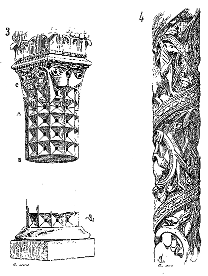 La fig. 4 2 explique cette combinaison. En A sont les pannes, en B le faîtage; la ligne ponctuée CD indique les chevrons. Les murs pouvaient ainsi être réduits d'épaisseur. Les extrémités de l'entrait s'assemblent à queue d'aronde dans la sablière E; celle F est entaillée pour recevoir les abouts des chevrons qui sont retenus sur le faîtage, les pannes et les sablières, par des chevilles de chêne. Mais ce moyen présente d'assez grands défauts; les pannes, posées de plat, sont faibles; elles ne portent que sur leurs tenons. Aussi n'employa-t-on ce système d'assemblage de charpente qu'assez rarement; nous ne le retrouvons guère adopté dans les constructions du Nord. Les liens courbes, si les arbalétriers étaient trop chargés, devaient, par leur pression sur l'entrait, le faire fléchir. Ces fermes ne pouvaient être employées que pour couvrir des nefs étroites, et n'eussent pu, exécutées sur de grandes dimensions, conserver leur rigidité. Ces exemples font voir qu'alors les charpentiers ne se rendaient pas un compte exact de la fonction de l'entrait, qui doit être uniquement d'empêcher l'écartement des arbalétriers, mais qui ne peut et ne doit supporter aucune charge; aussi, on changea promptement les jambettes A (fig. 3), et, les retournant, on les assembla dans l'extrémité inférieure du poinçon (5). L'entrait restait libre alors, suspendu au milieu de sa portée par le poinçon, et les deux jambettes, converties en liens B, arrêtèrent parfaitement la flexion des arbalétriers. Ces données élémentaires avaient été adoptées déjà dans l'antiquité; mais la préoccupation des architectes romans de donner à leurs charpentes l'apparence d'une voûte avait fait préférer le système vicieux dont les fig. 3 et 4 nous donnent des exemples. Les petites dimensions des charpentes romanes encore existantes et leur extrême rareté ne nous permettent pas de nous étendre sur l'art de la charpenterie à cette époque reculée; nous serions obligés de nous lancer dans les conjectures, et c'est ce que nous voulons éviter.