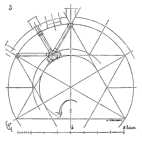 Il ne faut pas oublier que les fondateurs de l'ordre du Temple étaient au nombre de neuf (carré de 3), qu'il ne leur fut permis d'ordonner de nouveaux frères qu'après neuf années, et que les nombres 3 et 9 se retrouvent fréquemment dans les chapelles des commanderies. La grande rotonde de Paris possédait à l'intérieur six piliers, et extérieurement douze travées (fig. 1). Son tracé n'avait pu être obtenu donc que par deux triangles équilatéraux se pénétrant, ainsi que l'indique la figure 3.