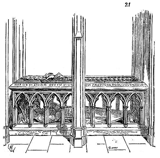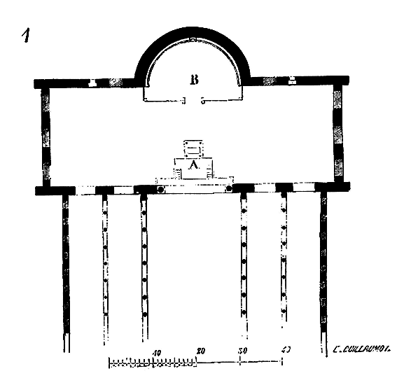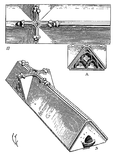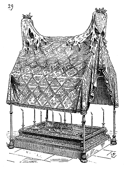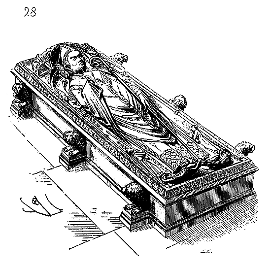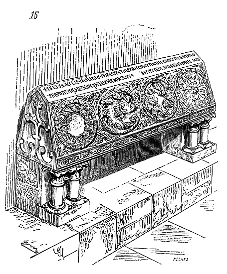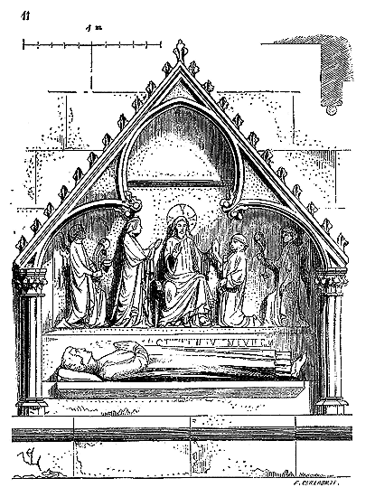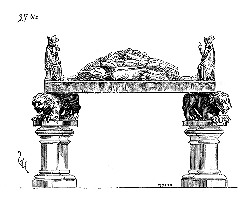 Les premiers chrétiens, contrairement à l'usage admis chez les Grecs et chez les Romains, ne brûlaient pas les corps, ils les ensevelissaient dans des niches pratiquées dans les parois de cryptes, ou dans des sarcophages de pierre ou de marbre. Ces sarcophages, si les personnages étaient considérables, restaient souvent apparents dans des chambres souterraines; ils étaient décorés de sculptures symboliques ou de signes religieux, croix, monogrammes du Christ, colombes, etc. Habituellement ils étaient posés sur des dés ou colonnettes, afin de les isoler de terre. Ces sarcophages se composaient d'une auge oblongue quadrangulaire, avec couvercle en forme de toit à deux pentes ou bombé. Le corps du défunt était déposé dans cette auge 17. Les tombeaux du moyen âge procèdent de ce principe. Mais, vers le milieu du XIIe siècle, on plaça sur le couvercle l'effigie du mort, et alors le sarcophage n'était plus ordinairement qu'un simulacre et le corps était déposé au-dessous, dans une fosse ou un petit caveau. Ce fut aussi vers cette époque que l'on se contenta souvent de placer sur le cercueil enterré une dalle gravée ou une lame de bronze représentant le défunt. La partie principale du tombeau, le sarcophage, ou plutôt son simulacre, ne fut bientôt qu'un accessoire, un véritable socle portant des figures couchées, et le monument, outre ces statues, se composa de dais élevés ou de sortes de chapelles en façon de larges niches.