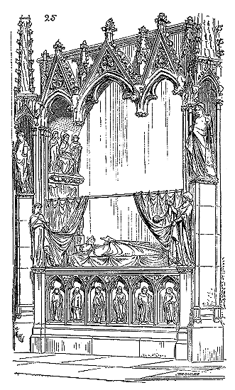 Ce n'est que depuis le XVIe siècle que l'on a imaginé de donner aux sépultures un caractère funèbre; de les entourer d'emblèmes, d'attributs ou d'allégories qui rappellent la fin, la décomposition, la douleur sans retour, l'anéantissement, la nuit, l'oubli, le néant. Il est assez étrange que ces idées se soient fait jour chez des peuples qui se piquent d'être chrétiens, et chez lesquels, en chaire, on montre la mort comme une délivrance, comme la fin des misères attachées à la courte existence terrestre. Les païens, par opposition, ont donné aux monuments funéraires un caractère plutôt triomphal que désolé. Le moyen âge avait conservé cette saine tradition; les tombeaux qu'il a élevés n'adoptent jamais ces funèbres attributs mis à la mode depuis le XVIe siècle, ces effets théâtrals ou ces froides allégories qui exigent toujours pour être comprises la présence d'un cicerone.