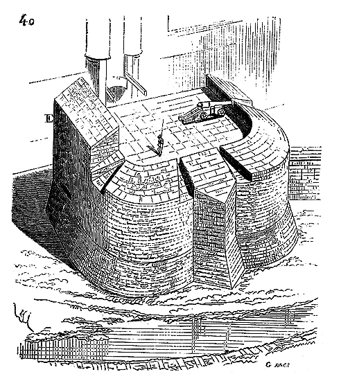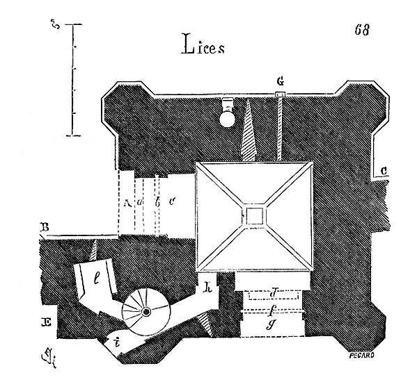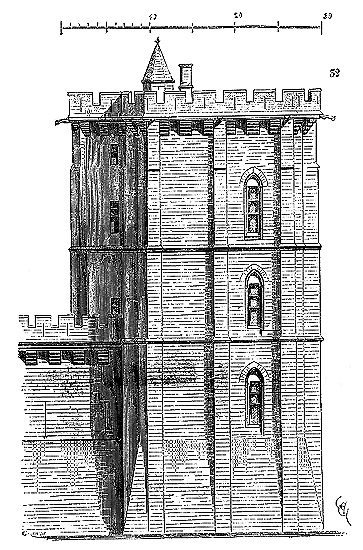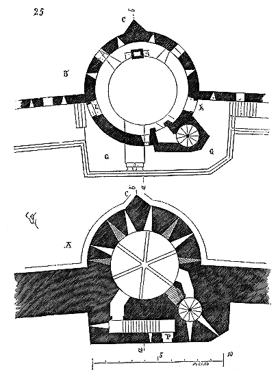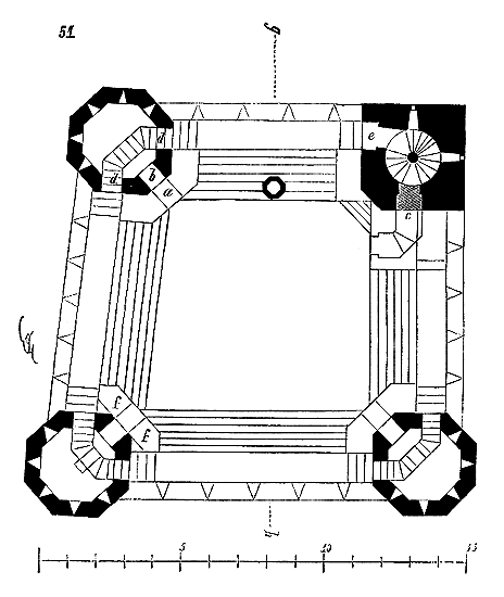 Note 13: (retour) Parmi les châteaux importants que les templiers avaient élevés en Syrie, nous citerons ceux de Tortose (Antarsous) de Safita, d'Areymeh, de Toron et d'Athlit. Ces châteaux renferment habituellement un gros donjon carré ou sur plan barlong et leurs enceintes sont également flanquées de tours quadrangulaires. «Les châteaux de Safita, d'Areymeh, d'Athlit, et surtout la forteresse de Tortose», dit M. G. Rey, dans son Essai sur la domination française en Syrie, «nous fournissent une série de types permettant de donner une étude aussi complète que possible de cet art, dont les meilleures productions se trouvent dans les principautés d'Antioche et de Tripoli, si riches, la première particulièrement, en monuments byzantins.» Tortose, adossée à la mer, fut la dernière place qu'occupèrent les templiers en Orient. Ils n'évacuèrent cette forteresse que le 5 juin 1291. En Occident, les templiers adoptèrent également, pour la construction de leurs donjons, le plan carré ou barlong. C'est sur cette donnée qu'était bâtie la tour dite de Bichat, à Paris, et qui ne fut détruite qu'en 1855. (Voy. TOUR.)