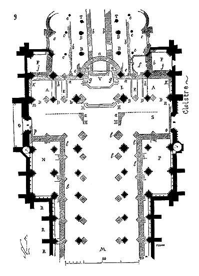 Réunissant les renseignements que nous avons pu nous procurer sur le Temple de Paris 9, nous donnons le plan de l'église (fig. 1). La rotonde datait de la première moitié du XIIe siècle. Après la sortie des templiers de la Palestine, cette rotonde fut augmentée au porche A, dont parle Sauval, et un peu plus tard de la grande nef B. Le bas du clocher C datait également du XIIe siècle, et l'étage du beffroi du commencement du XIIIe siècle.