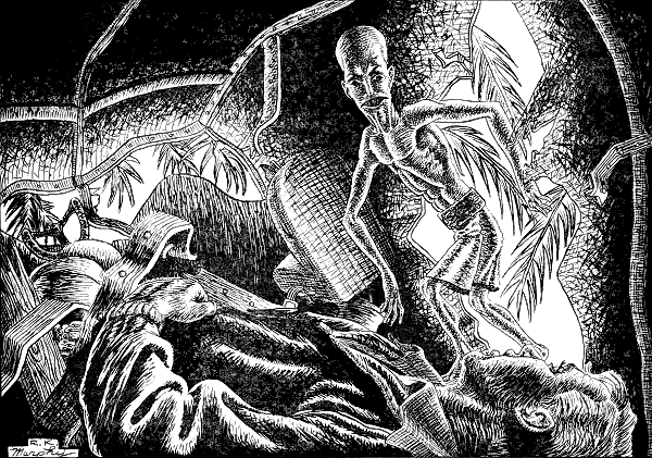 Lizard-men busied themselves about Garin, girding on him the short kilt and jewel-set belt which were the only clothing of the Caverns. When they were finished, the chieftain took his hand and drew him to the door.