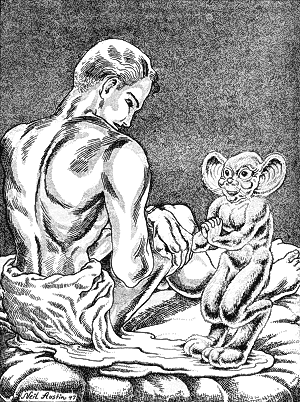 If the lizard-folk had been goblin in their grotesqueness this visitor was elfin. It was about three feet high, its monkey-like body completely covered with silky white hair. The tiny hands were human in shape and hairless, but its feet were much like a cat's paws. From either side of the small round head branched large fan-shaped ears. The face was furred and boasted stiff cat whiskers on the upper lip. These Anas, as Garin learned later, were happy little creatures, each one choosing some mistress or master among the Folk, as this one had come to him. They were content to follow their big protector, speechless with delight at trifling gifts. Loyal and brave, they could do simple tasks or carry written messages for their chosen friend, and they remained with him until death. They were neither beast nor human, but rumored to be the result of some experiment carried out eons ago by the Ancient Ones.