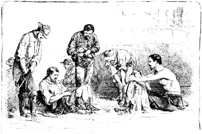 I found that in prison, as at home, there were some who were fitted for one thing and some for another. The same adaptability for different pursuits were found there as are found in our home every day life. There were mechanics, tradesmen, artists and laborers. Some could take beef bones and out of them fashion all manner of beautiful trinkets, such as napkin rings, bibles, crochet needles, etc., others could make pencil sketches of the different scenes that were daily witnessed, portraits of prisoners, sketches of the different portions of the stockade and quarters. Others were better adapted to buying and selling, and still others could repair or make shoes. I remember seeing one pair of shoes made that I must describe. The sole was shaped out of a piece of pine board or plank, and the uppers were made out of an old pair of boot legs; a groove was made entirely around the sole, and the leather pegged on, so that the sole came out about half an inch each side, making a really artistic pair of shoes, and durable too, fastened together with wooden pegs whittled out by hand. I had a pair of slippers made[Pg 49] out of the cape of my overcoat that were not only comfortable, but serviceable as well, and not at all bad looking. In this prison every trade was represented and nearly all were plied to some extent, sometimes for the purpose of gaining a living and sometimes to keep the mind occupied, and to make their quarters more comfortable.