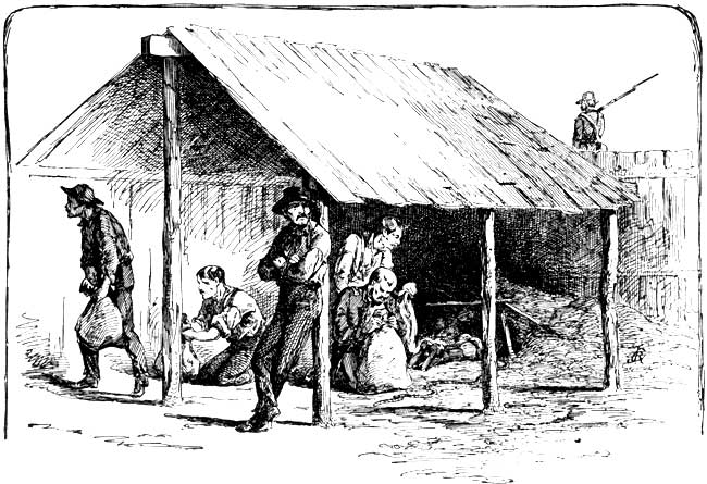 moving into the stockade—skirmishing—mr. cashmeyer’s sutler wagon—captain irsh bucked and gagged by order of tabb—captain tabb relieved—how we passed the time—the meetings—gambling houses—social and singing circles.