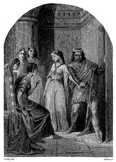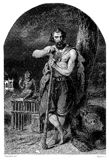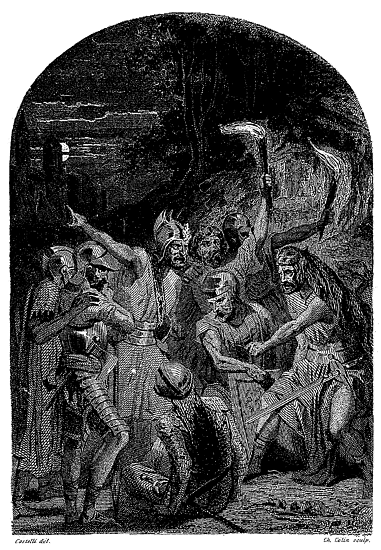 --Il y a trois semaines, en venant ici, je traversais l'Anjou... Un jour, je m'étais trompé de route dans une forêt, la nuit vient; après avoir longtemps, longtemps marché, m'égarant de plus en plus au plus profond des bois, j'aperçois au loin une grande lueur qui sortait d'une caverne: j'y cours, je trouve dans ce repaire une centaine de joyeux Bagaudes, festoyant autour du feu avec leurs Bagaudines, car ils ont souvent avec eux des femmes déterminées... Les autres nuits, ils avaient fait, comme d'habitude, une guerre de partisans contre les seigneurs franks, nos conquérants, attaquant leurs burgs, ainsi que ces barbares appellent leurs châteaux, combattant avec furie, sans merci ni pitié, pillant les églises et les villas épiscopales, rançonnant les évêques, pendant même parfois les plus méchants de ces prêtres, assommant et dévalisant les collecteurs du fisc royal; mais donnant généreusement au pauvre monde ce qu'ils reprenaient aux riches prélats, aux comtes franks, ces premiers pillards de la Gaule, et délivrant les esclaves qu'ils rencontraient enchaînes par troupeaux... Ah! par Aëlian et Aman, patrons des Bagaudes, c'est une belle et joyeuse vie que celle de ces gais et vaillants compères!... Si je n'étais revenu en Bretagne pour y voir encore une fois ma vieille mère, j'aurais avec eux couru un peu la Bagaudie en Anjou!