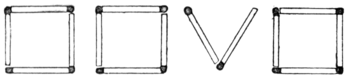 Lay five matches on the table and request a member of the company to form a well-known quotation from Shakespeare by the addition of three more matches (Fig. 14). “But,” some one will say, “how does KINI represent a Shakespearean quotation?” Your reply is obvious: “Can’t you see KINI is ‘a little more than kin, but rather less than kind’?”