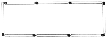 Arrange eight matches as shown in Fig. 24, and state that this enclosure, formed by eight hurdles, is supposed to hold one hundred sheep. Ask your friends how many 67 more hurdles would be required to enable the enclosure to contain two hundred sheep? The reply is generally eight more, and your friends will be surprised to learn that only two more hurdles are required—one at each end across the enclosure. Three hurdles being moved to admit of the introduction of the additional two, the pen will, of course, be doubled in size.