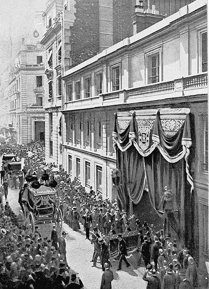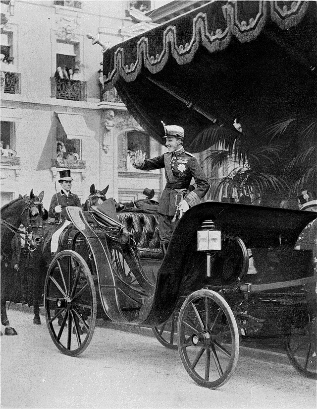 Le premier salut du roi Alphonse XIII sortant de la gare du Bois de Boulogne.