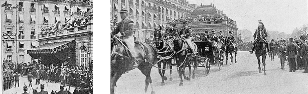 L'arrivée à Paris: le roi monte en voiture. Le cortège partant de la gare de la porte Dauphine.