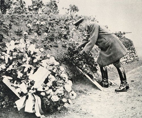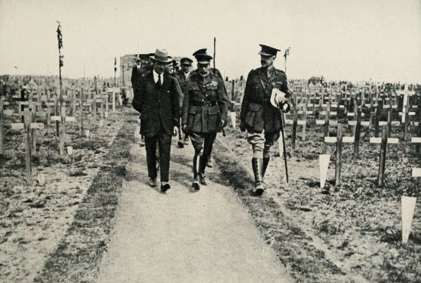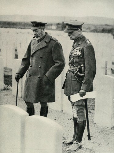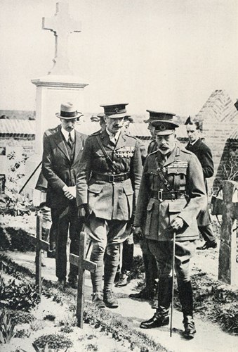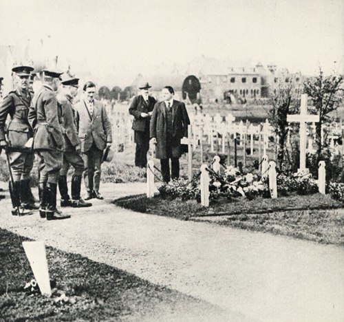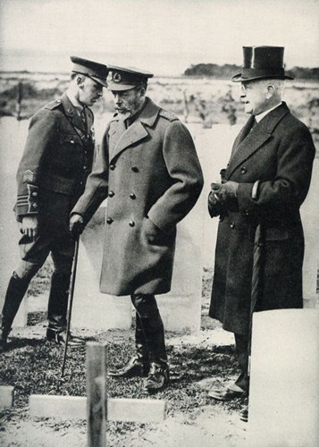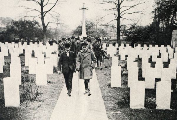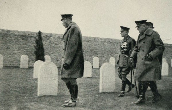 On his way to the Menin Gate of Ypres city, the King directed the cars to turn aside to the Town Cemetery, that he might stand silent for a few moments by the graves of Prince Maurice of Battenberg, Lord Charles Mercer-Nairne, Major the Hon. W. Cadogan, and other officers, some of those of his own personal friends whom the war claimed, and whose graves lie among those of their men, marked by the same simple memorials.