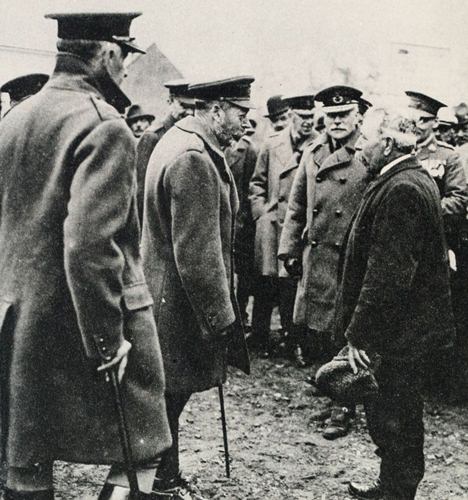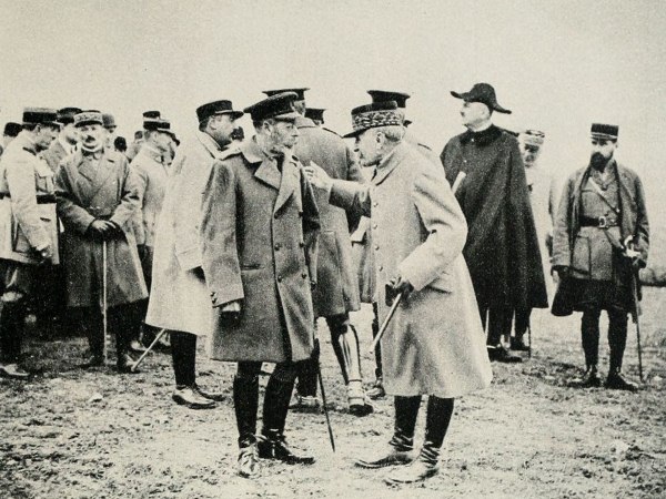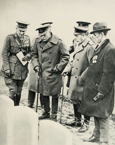 The King, reaching Notre Dame de Lorette, walked up the steep slope of the hill to a little plateau, in the centre of the thickly clustered French graves, where he was met by Marshal Foch, General Weygand (the Marshal’s Chief of Staff), General Lacapelle, commanding the First Army Corps, and M. Cauzel, Prefect of the Pas-de-Calais.