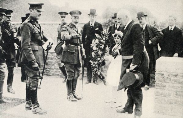 From Hop Store the King went on to Brandhoek, which was a comparatively safe area during the war, and therefore a post for field ambulances. The old Military Cemetery, which the King visited, was opened in May, 1915, in a field adjoining the Dressing Station, and was closed in July, 1917. It shelters the bodies of 601 soldiers from the Home Country, 62 from Canada, 4 from Australia, and 2 of the Bermuda Volunteer Rifle Corps. In July, 1917, the Military Cemetery was opened 300 yards away, and in August, 1917, a third cemetery was opened.