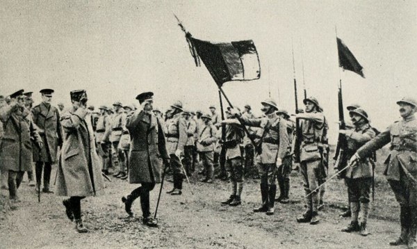 To the French people Notre Dame de Lorette is la colline sacrée of the Great War. It was the key for the defence of Flanders and Artois, the most bitterly contested strong point on French soil, not excepting Verdun. For twelve continuous months, without a day’s interruption, one battle raged round the hill. Every yard of its soil bears shell scars and has been dyed with noble blood. Altogether, over 100,000 men gave up their lives around this hallowed hill, and it was the most fitting place for the King to pay his homage to the noble dead of the French Army.