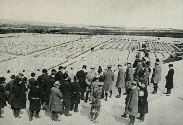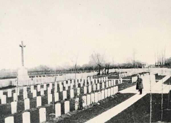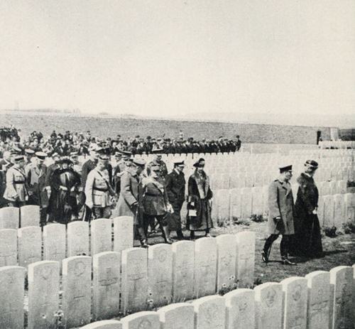 The route of the pilgrimage went from Ypres to Vlamertinghe, passing on the way the British cemetery behind Ypres Reservoir, the Asylum British Cemetery, the cemetery on the Dickebusch Road, and the Railway Château Cemetery. At Vlamertinghe Military Cemetery the King stopped and, as has already been noted, visited the Canadian graves with the High Commissioner for Canada, as well as paying his tribute to the many British buried there. This cemetery, between Poperinghe and Ypres, was begun by the French troops, then holding part of the line here. It contains 1,114 graves of British soldiers, 52 of Canadian, 4 of Australian, 2 of South African, 2 of soldiers of the Royal Newfoundland Regiment, one of an Indian soldier, and one of an unknown soldier. Very many of the British graves are of Territorial dead. There are, for example, nearly 250 Lancashire Territorials buried there: those splendid men who proved, both in Gallipoli and France, that the town-bred population of the Mother Country was fit, in courage and endurance, to rank with the historic regiments of the line and with the young giants from the Oversea Dominions.