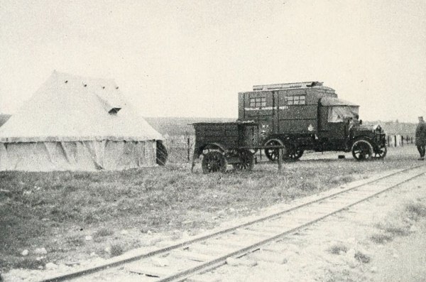 At several points the workers of the Imperial War Graves Commission—practically all of whom had gone through the campaign, and now are reverently and carefully tending the last resting-places of their fallen comrades—assembled to greet the King. He spoke with them also, giving them thanks for their work and noting their war medals and asking them about their life in the camps, or with the mobile caravans which, in the districts where housing cannot yet be found, move from cemetery to cemetery, keeping fresh the tribute of grass and flowers and trees—caravans which bring back vividly one’s memory of the old British supply columns, for they are almost invariably led by a small self-important and well-fed dog.