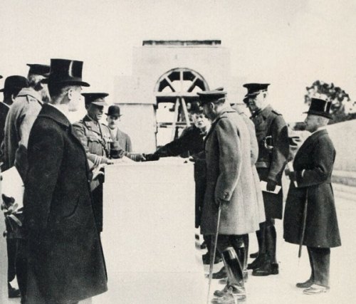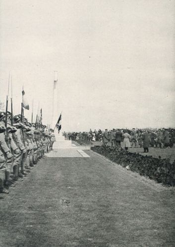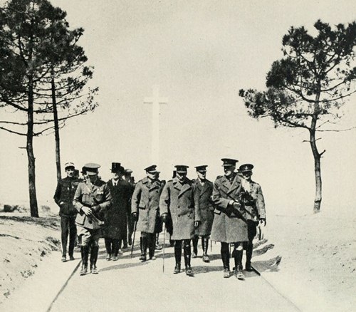Many places on the long trench line which stretched like a dreadful scar across Belgium and France the King knew during the days of the war. Very jealously the secrets of his visits to the Front had to be guarded then, especially when both the King and the Heir Apparent were at the same time in the battle-line; and no public record exists of them. But it is safe to say that Tyne Cot he saw for the first time this May afternoon. He understood how appalling was the task which his soldiers faced there, and, turning to the great “pill box” which still stands in the middle of the cemetery, he said that it should never be moved, should remain always as a monument to the heroes whose graves stood thickly around. From its roof he gazed sadly over the sea of wooden crosses, a “massed multitude of silent witnesses to the desolation of war.” It is indeed fitting that this should form, as it will, the foundation for the great Cross of Sacrifice shortly to be built up as a central memorial in this cemetery.