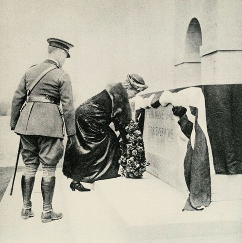 The King was met at the Menin Gate by representatives of the Belgian Government and Army, by Major Michelet and M. Lorel of the Belgian Graves Services, and by the Burgomaster of Ypres. The industrious re-builders of Ypres paused from their work for an hour and assembled to give him a hearty greeting. The King entrusted a chaplet of palms and bay leaves with a spray of red roses in memory of the Belgian dead to Major Michelet. He then congratulated the Burgomaster on the progress his citizens were making with the work of reconstruction. Sir Reginald Blomfield, architect of the memorial at the Menin Gate, submitted to the King the designs and plans of the monument. His Majesty emphasised the need that the names inscribed should be clear to all to read.