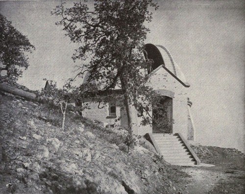 The Crossley dome is about 350 yards from the main Observatory, at the end of a long rocky spur which extends from the Observatory summit toward the south, and on which are two of the houses occupied by members of the Observatory staff. It is below the level of the lowest reservoir, “Huyghens,” which receives the discharge from the hydraulic machinery of the 36-inch refractor, and therefore the water engine furnished by Mr. Crossley for turning the dome can not be used, unless a new water system—overflow reservoir, pump and windmill—is provided. In this respect a better site would have been a point on the south slope of “Kepler,”—the middle peak of Mount Hamilton—just above the Huyghens reservoir. No addition to the present water system would then have been needed. The[Pg 13] slope of the mountain at this place might cut off the view of the north horizon, but since the telescope can not be turned below the pole, this would be a matter of no consequence. Water-power for the dome is not, however, really necessary.