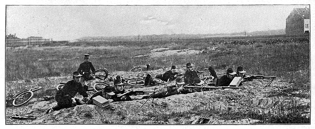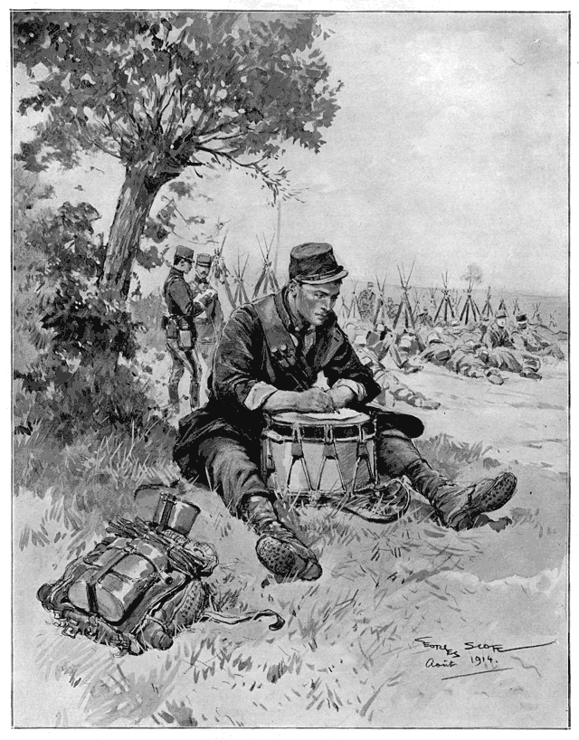 L'étape a été dure. On marche vers le front. On a hâte d'y être. On y sera tout à l'heure... En attendant, on se repose. On bavarde gaiement, ou l'on sommeille à côté des faisceaux. Le tambour, lui, s'est dit qu'il avait mieux à faire que de bavarder ou de dormir, et que, puisqu'il est un des rares hommes de la compagnie qui ait une table à écrire à sa disposition, c'est bien le moins qu'il en profite. Et il s'est assis devant sa table à écrire... C'est la «caisse» qui n'a jamais «battu» que des rassemblements et des marches, et qui, dans quelques heures peut-être, battra la charge heureuse, la victorieuse course à l'ennemi.