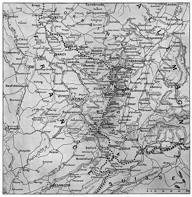 En Alsace, nous demeurons fortement appuyés sur la ligne Thann, Cernay et Dannemarie. Les forces allemandes se retirent en grand désordre vers le nord et vers l'est.