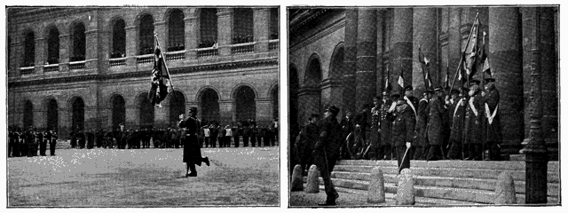 Dans la cour d'honneur du noble hôtel de Mansart, le général Niox attendait, le drapeau du 132e allemand. Le sous-officier qui l'avait apporté le remit au doyen des dix invalides encore hospitalisés, Pierre Dumont, un ancien combattant de Crimée, d'Italie, et aussi de 1870-1871,--étrange retour de fortune, pour ce vaincu d'autrefois dont l'émotion dut être intense quand, fièrement dressé sur son unique jambe, il présenta le drapeau ennemi qui fut courtoisement salué par tous les assistants.