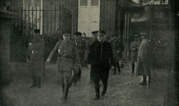Major General John J. Pershing, appointed to organize and command the American forces in France, is shown landing in France on June 12, 1917. French officers and officials of high rank are there to welcome him. His arrival is recognized as an epoch-making date in the war, for it foreshadows the creation of a great American Army in France.