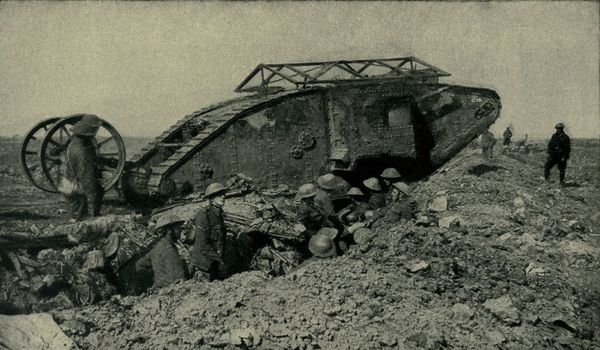 It was in this battle that the British for the first time introduced a new type of armored cars which proved veritable fortresses on wheels, and came to be popularly known as "tanks." These destructive engines of warfare were from twenty to forty feet long and were painted a dull drab, or some unassuming color calculated to blend with the tones of the landscape. In a dim light they suggested the giant slugs of a prehistoric age. Sliding along the ground on caterpillar wheels, with armored cheeks on each side of the head, above which guns stuck out like the stalked eyes of land crabs, their first appearance in this sector may well have created consternation among the German troops who saw them for the first time. There was something uncanny about these steel-scaled monsters that slid over the ground as it were on their stomachs, balanced by a flimsy tail supported on two wheels. Weighing many tons, when the "tank" came to an obstacle, such as a house or wall, it rammed the obstruction with its full weight, and then climbing over the débris lumbered on its way. Through vast craters and muddy shell holes and over trenches the monsters waddled along, scattering death and destruction as they advanced. The German soldiers, after the first consternation caused by the appearance of these war engines in the field, bravely attacked them; swarming over the sides of the "tanks" and seeking to batter in the steel scales and armored plates and to silence the guns that spouted fire from the head, but the daring efforts were useless and caused many casualties. Machine-gun fire was also ineffectual. They could only be disabled by a direct hit from a large gun. It is said that the Germans voiced their disgust for this kind of warfare, and protested that the British were not fighting fair!