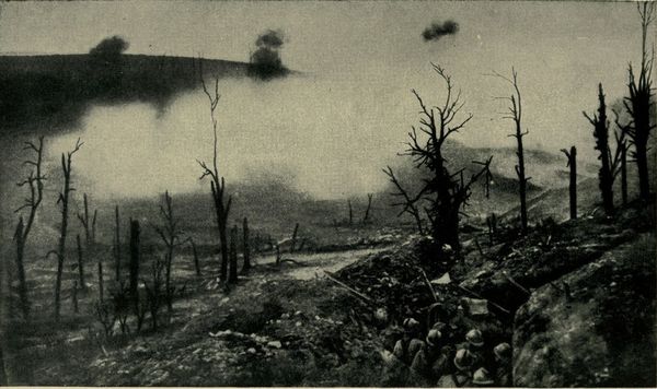 In the battered and shell-pitted region to the northwest of Pozières fighting between the British and German troops continued unceasingly. The slight gains made by the British troops were won only by the greatest risk and daring, for the whole plateau between Thiepval and Pozières (about 3,000 yards) lay open to the German fire from the former place. A great part of (p. 012) it could be reached by machine guns, while German batteries at Courcelette and Grandcourt commanded the ground at close range. A network of German trenches, well planned, stretched in almost every direction. Flares and shell fire made the region as bright as day during the night, and it was only by rushing a trench from saps made within a few feet of the objectives or by breaking into a trench and bombing along it that the British were able to achieve any small gains. And gains were made on this terrible terrain daily, though only a few yards might be won, and a dozen or more prisoners captured.