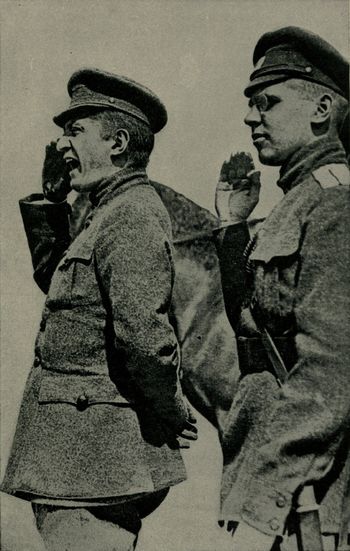 At first the Germans thought they could rush a "tank" as they would a fort, and lost heavily in such futile attacks; they could (p. 022) make no impression on the steel "hide" of the monsters. Once astride a trench, the guns of the tank could rake right and left, mowing down the defenders whose volleys pattered harmlessly on the steel plates of the war engine.