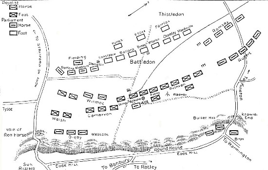 In the following pages an endeavour has been made to give a concise account of the physical features of the Edge Hill district, as well as to describe the events of the first great battle of the Civil War, with which it is so intimately associated. The intention is to provide a handbook for the guidance of the visitor rather than to attempt any elaborate historical or scientific work. Though Nugent’s “Memorials of John Hampden” has supplied the basis of the information, Clarendon’s “History of the Great Rebellion,” the various pamphlets of the time, and Beesley’s “History of Banbury,” have also been freely used. In order to avoid burdening the pages with foot notes, a catalogue of works upon the subject is printed as an appendix, and the letters and numbers throughout the text refer thereto. The catalogue, it is hoped, may be of use to the future student. The plans of the battle, based upon Nugent’s account, must be looked upon as merely diagrammatic, the scale being unavoidably distorted for the purpose of showing the conjectured positions of the troops. In the plans it may be worth note that the troops then known as “dragooners” are classed with the infantry.
