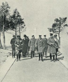The King, reaching Notre Dame de Lorette, walked up the steep slope of the hill to a little plateau, in the centre of the thickly clustered French graves, where he was met by Marshal Foch, General Weygand (the Marshal’s Chief of Staff), General Lacapelle, commanding the First Army Corps, and M. Cauzel, Prefect of the Pas-de-Calais.