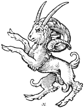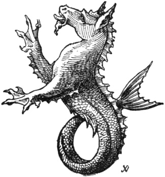 Bossewell (“Works of Armorie,” 1589), in his peculiar mixture of English and Latin, gives a quaint description of the animal: “This water-horse of the sea is called a hippotame, for that he is like an horse in back, mayne, and neying: rostro resupinato a primis dentibus: cauda tortuosa, ungulis binis. He abideth in the waters on the day, and eateth corn by night et hunc Nilus gignit.” The latter may be classed with those fantastic ornamental forms frequently employed in fountains and waterworks, such as the Ichthyocentaur, i.e., a combination of man and horse, or the centaur with a fish’s extremity.