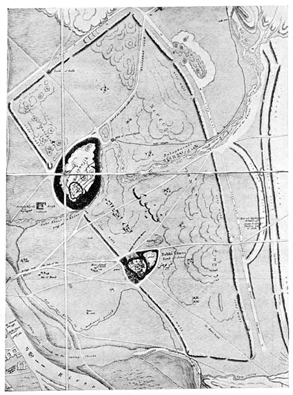 The situation of the ruins of the palaces of Nineveh is well shown by the accompanying reproduction of the plan of page 2the city made by Commander Felix Jones, I.N. The remains of the older palaces built by Sargon II (B.C. 721–705), Sennacherib (B.C. 705–681), and Esarhaddon (B.C. 681–668) lie under the hill called Nabi Yûnis, and those of the palaces and other buildings of Ashur-bani-pal (B.C. 681–626) under the mound which is known locally as "Tall al-'Armûshîyah," i.e., "The Hill of 'Armûsh," and "Kuyûnjik." The latter name is said to be derived from two Turkish words meaning "many sheep," in allusion to the large flocks of sheep that find their pasture on and about the mound in the early spring. These two great mounds lie close to the remains of the great west wall of Nineveh, which in the time of the last Assyrian Empire was washed by the waters of the river Tigris. At some unknown period the course of the river changed, and it is now more than a mile distant from the city wall. The river Khausur, or Khoser, divides the area of Nineveh into two parts, and passing close to the southern end of Kuyûnjik empties itself into the Tigris. The ruins of the wails of Nineveh show that the east wall was 16,000 feet long, the north wall 7,000 feet long, the west wall 13,600 feet, and the south wall 3,000 feet; its circuit was about 13,200 yards or 7½ miles.