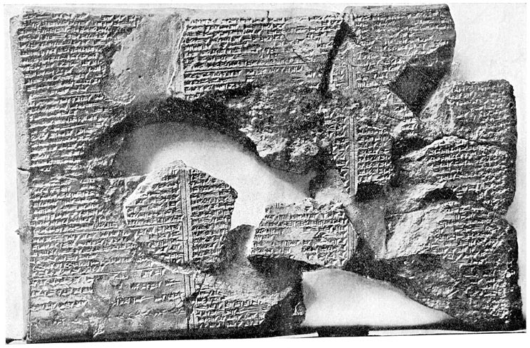 In the spring of 1852 Layard, assisted by H. Rassam, continued the excavation of the "South West Palace" at Kuyûnjik. In one part of the building he found two small chambers, opening into each other, which he called the "chamber of records," or "the house of the rolls." He gave them this name because "to the height of a foot or more from the floor they were entirely filled" with inscribed baked clay tablets and fragments of tablets. Some tablets were complete, but by far the larger number of them had been broken up into many fragments, probably by the falling in of the roof and upper parts of the walls of the buildings when the city was pillaged and set on fire by the Medes and Babylonians. The tablets that were kept in these chambers numbered many thousands. Besides those that were found in them by Layard, large numbers have been dug out all along page 3 page 4the corridor which passed the chambers and led to the river, and a considerable number were kicked on to the river front by the feet of the terrified fugitives from the palace when it was set on fire. The tablets found by Layard were of different sizes; the largest were rectangular, flat on one side and convex on the other, and measured about 9 ins. by 6½ ins., and the smallest were about an inch square. The importance of this "find" was not sufficiently recognized at the time, for the tablets, which were thought to be decorated pottery, were thrown into baskets and sent down the river loose on rafts to Basrah, whence they were despatched to England on a British page 5 page 6man o' war. During their transport from Nineveh to England they suffered more damage from want of packing than they had suffered from the wrath of the Medes. Among the complete tablets that were found in the two chambers several had colophons inscribed or scratched upon them, and when these were deciphered by Rawlinson, Hincks and Oppert a few years later, it became evident that they had formed part of the library of the Temple of Nebo at Nineveh.